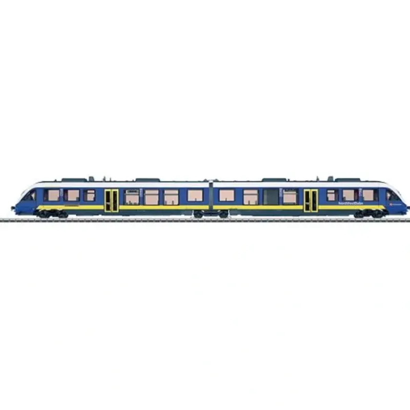 This is a Marklin, Inc 37734 HO Scale LINT 41 Class 648.2 Diesel Railcar w/Low Entry, 3-Rail w/Digital & Sound NordWestBahn NWB (Era VI, blue, yellow). The train has an mfx digital decoder and extensive sound functions. It also has controlled high efficiency propulsion. The train has a powerful motor with a bell-shaped armature and a flywheel, mounted in the Jakobs truck. 2 axles powered. Traction tires. The train has factory-installed interior lighting. The headlights and the interior lighting are maintenance-free warm white LEDs. The headlights and marker lights change with the direction of travel on both units. The train destination sign has prototypical yellow LEDs. The headlights, train destination sign, and dual red marker lights will work in conventional operation and can be controlled digitally. The frame and bodies have detailed construction and there is a free view through the windows. The train has interior details, closed diaphragm connections, and a guide mechanism on the Jakobs truck between the rail car halves. There is a representation of the center buffer coupling at the ends of the train. Total length 48.1 cm / 18-15/16. Highlights: Factory-installed interior lighting included. mfx decoder with extensive sound functions. Lighted train destination signs.