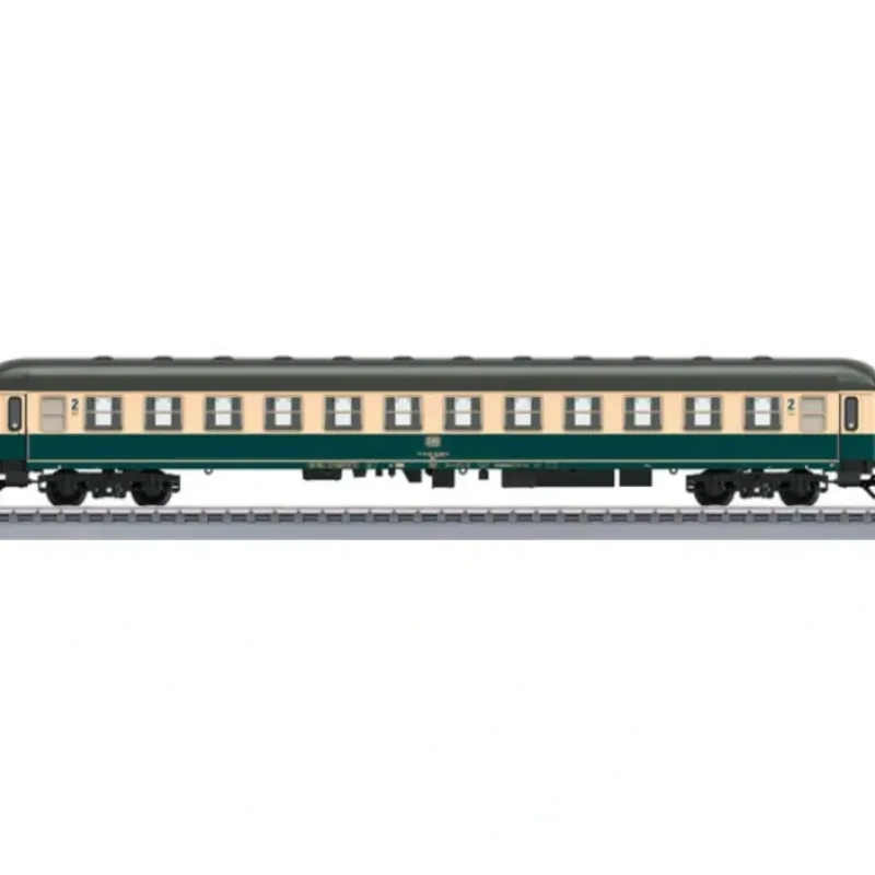 This is a Marklin 43923 HO Scale German Federal Railroad DB Type Bm 234 2nd Class Compartment Car – 3-Rail – Ready to Run (Era IV, Mid-1980s, ocean blue, beige). Displays plastic body, metal wheels. amd relex couplers.