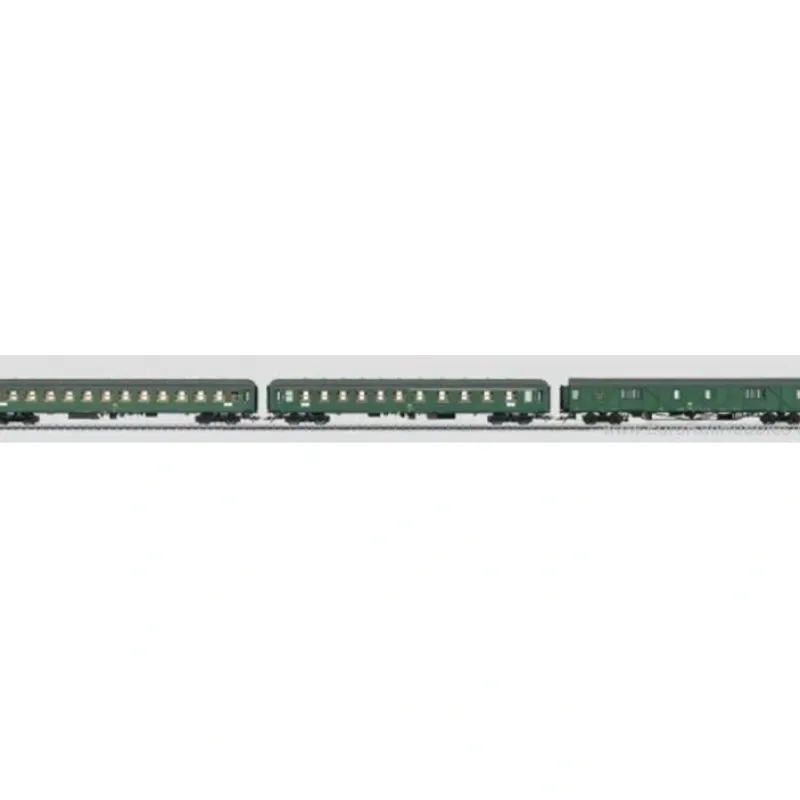 This is a Marklin, Inc 43990 HO Scale Fast Passenger Train Car Set 1. Prototype: 3 different design German Federal Railroad (DB) fast passenger train cars for the train route Augsburg – Donauwrth – Treuchtlingen – Nrnberg. 1 type MDyge 986 express freight baggage car as a temporary baggage car, with walls sheathed with panels. 1 type ABm 225 express train compartment car, 1st/2nd class. 1 type Bm 234 express train compartment car, 2nd class. All of the cars in a chrome oxide green basic paint scheme. The cars look as they did around 1975. Model: The minimum radius for operation is 360 mm / 14-3/16. The temporary baggage car has Pennsylvania style trucks. The express train passenger cars have Minden-Deutz heavy design trucks. All of the cars have factory-installed interior lighting with warm white LEDs. The express train passenger car, 2nd class, has a factory-installed pickup shoe. The entire consist of cars can be supplied with power by means of the factory-installed, current-conducting couplers. The cars must be coupled together in a permanently defined order to do this. Total length over the buffers 83.2 cm / 32-3/4. Highlights: Train route: Augsburg – Donauwrth – Treuchtlingen – Nrnberg. All of the cars have factory-installed LED interior lighting. The type MDyge 986 temporary baggage car is new tooling. Current-conducting couplers between the individual cars.