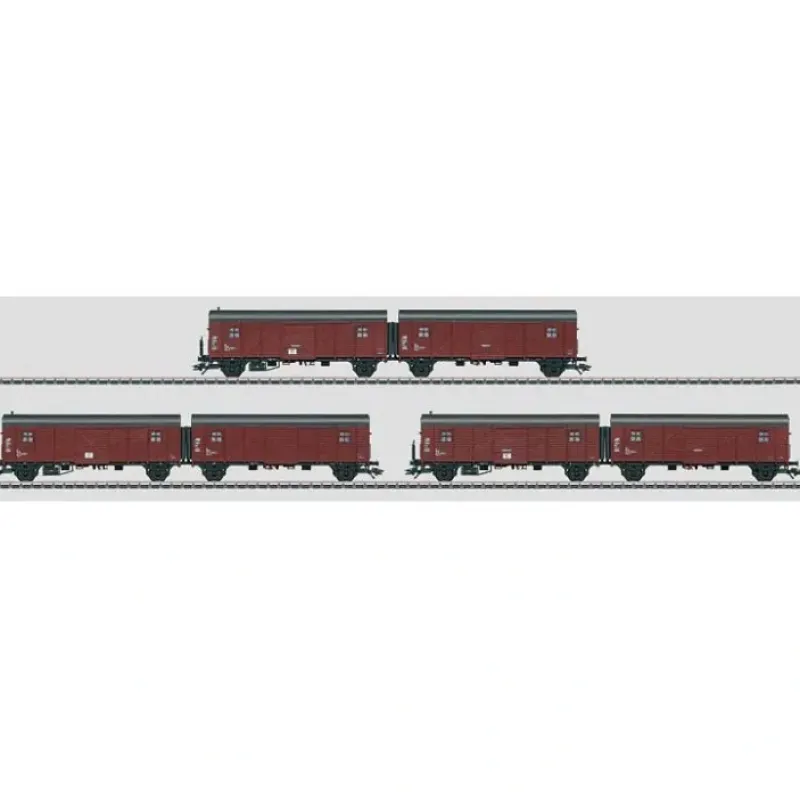 This is a Marklin, Inc 48850 HO Scale Leig-Einheiten Hrs-z 330 LCL Boxcar Set – Exclusiv 3 Car Pairs, German Federal Railroad DB (Era IV, Boxcar Red). Prototype: 3 German Federal Railroad (DB) Leig-Einheit / less-than-carload-lot type Hrs-z 330 (former Gllmghs 37) pairs of cars. Redish brown basic paint scheme. The cars look as they did in the mid-Seventies. Model: The cars in each pair are permanently coupled together and are connected by a diaphragm. The cars have older design buffers at the outer ends of each pair of cars. One car in each pair of cars has a brakeman’s platform. The cars have different car numbers. Each pair of car comes individually packaged, and there is a master package. Length over the buffers for each pair of cars 26.8 cm / 10-9/16. DC wheel set for each pair of cars 4 x 700580.