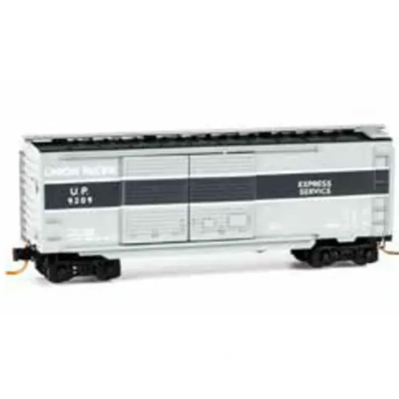 This 40 standard box car with double doors is painted gray with dark gray bands and white stripes and lettering. Built in 1940 as part of a 30-car fleet, which was used in express service, it ran on Allied Full-Cushion trucks. This express fleet covered in a month as many miles as most cars covered in a year.