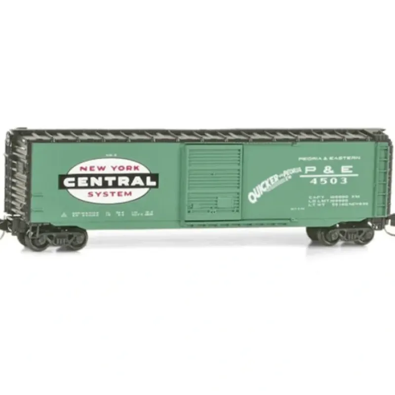 This is a MicroTrains 03100400 N New York Central 50′ Stranded Single Door Box Car. This 50 box car with single door is painted black with green sides. It bears the black, white and red NYC cigar band logo and is lettered in white. It was built in June 1959 by the Despatch Shops in East Rochester, NY, and runs on Bettendorf trucks. One of 45 cars from Lot 939-B, #4530 proudly advertises the Quicker via Peoria slogan.