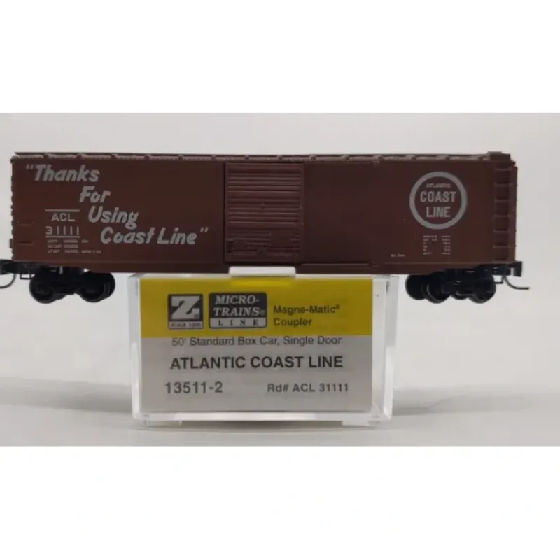 Here is a Micro-Trains 13511-2 Z Scale Atlantic Coast Line 50′ Standard Box Car #31111. This product features a plastic construction with plastic wheels and knuckle couplers.