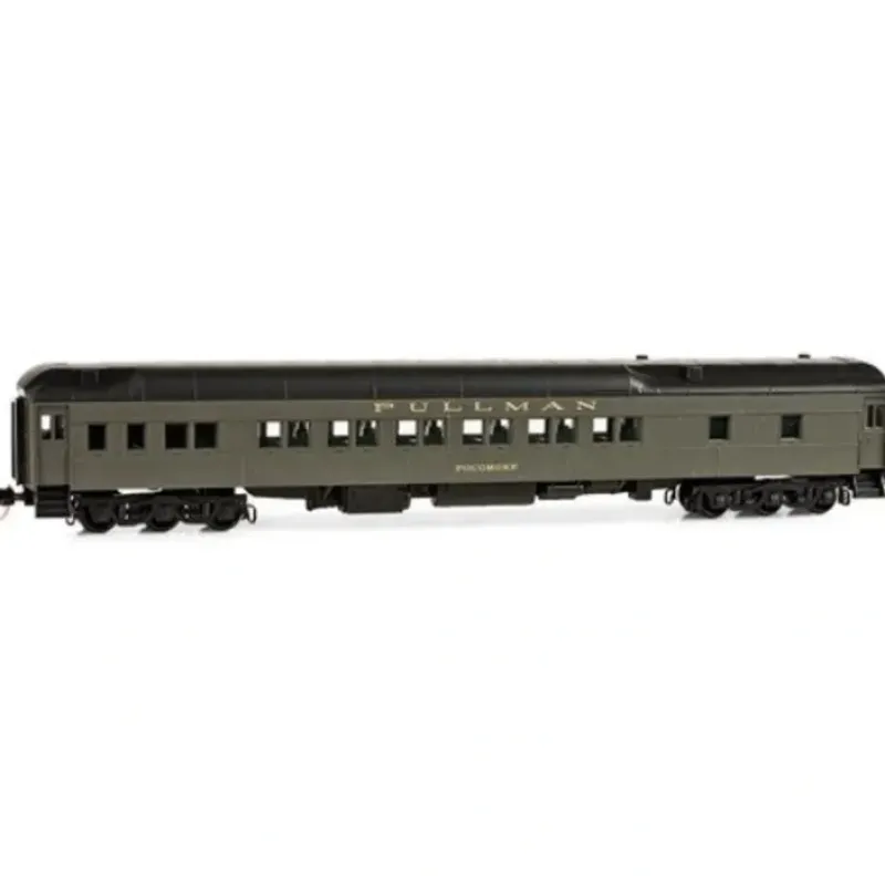 This is MicroTrains 14200030 Hwt 12-1 Sleeper BN Pcmk. Pullman Plan #3410 heavyweight 12-1 sleeper, ready to run. Burlington Northern Pocomoke (pullman green, black). This Burlington Northern heavyweight, named Pocomoke, is an 80′ 12 section-1 drawing room sleeper built in 1910 from Pullman Plan #3410. It’s painted Pullman Green with metallic gold Pullman lettering above the windows. It ran nationally from 1910 to the 1930s on six-wheel passenger trucks. Pullman’s heavyweight construction was modular, making it possible for floor plans to economically evolve with the times. Cars were generally in service through the 1960s.