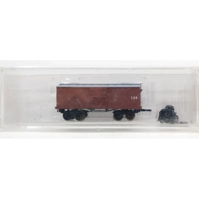 This is MicroTrains 15100030 26′ Box B&O CW. Civil War era 26′ wood boxcar, ready to run. Baltimore & Ohio #134 (boxcar red). With a rigid-frame truck and simulated link-and-pin style couplers, these 26′ cars will be the most prototypical N scale models for modeling in the 1800s.