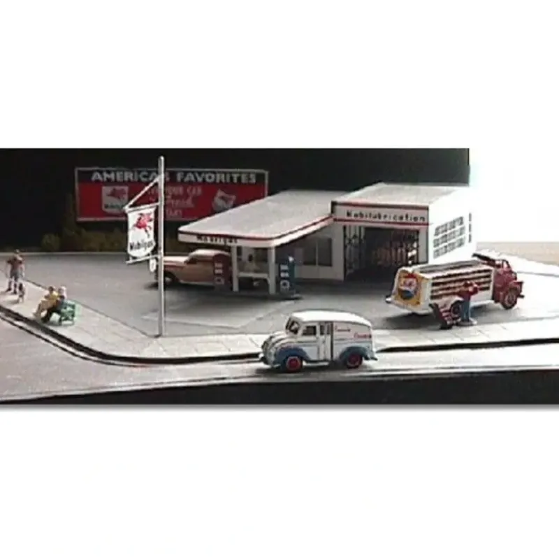 This is Showcase Express 104 Wally’s filling station. The little filling stationis typical of many others that were erected during the 40’s and 50’s. It wasn’t unusual to find three or four station like Wally’s competing at one intersection. They were typically owned and operated by local businessmen who would obtain a brand name franchise like Mobil, Standard, Texaco, etc. Our model is patterned after an existing service station off of oldd highway 99. The structure is not use as filling station today. It now houses a sucessful muffler repair shop. Its key features are: Assembles quick and easily. Exploded view assembly illustrations with step by step writtern instructions. Brass etched walls and windows. Detailed cast interior and pump island console. Corporate sign plates compatible with Microscale decals.
