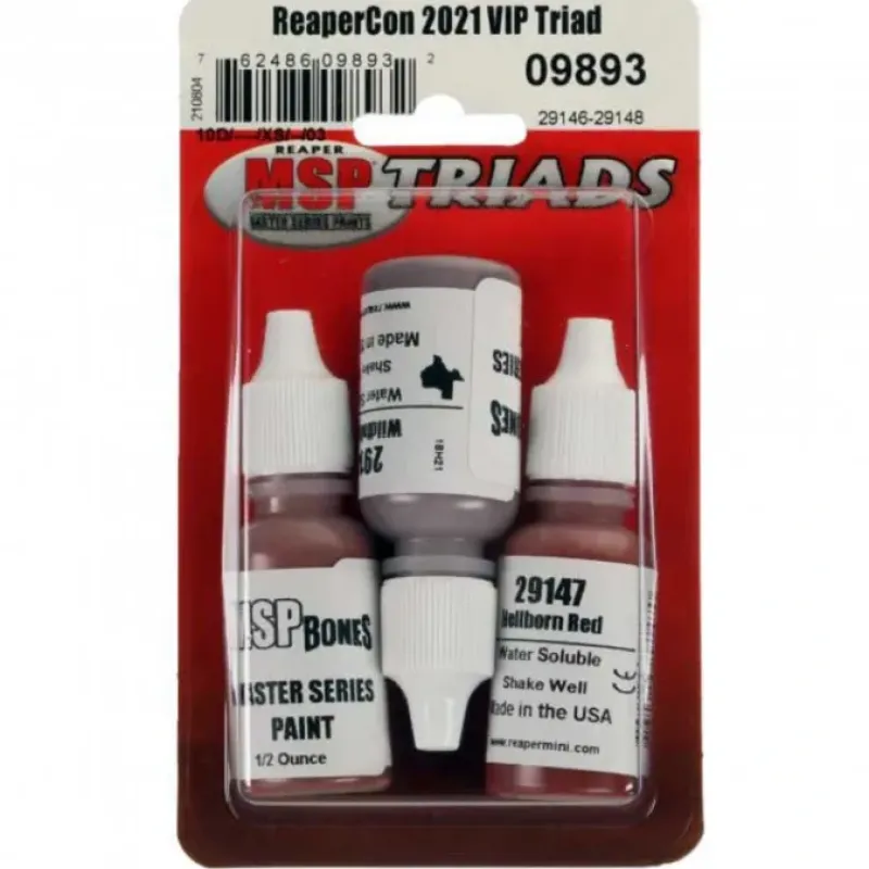 Triads include three .5 ounce bottles of Master Series Paints from Reaper Miniatures. This Triad was released in celebration of ReaperCon 2021.