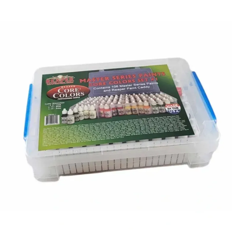 Excellent for thinned paint applications like layering, washes, and glazes. Smooth and fluid right out of the bottle means less thinning required, and enhanced flow properties make painting small details easier. Contains 108 Master Series Core Colors Paints, plus Paint Caddy. Includes MSP Core Colors in production from 09001-09116.