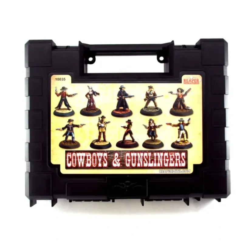 Reaper Miniatures’ boxed sets include unpainted and unassembled metal figures in a high quality, sturdy carrying/storage case. The case has two latches that provide a solid seal. Foam protects the contents within the case. Paints and glue are not included.