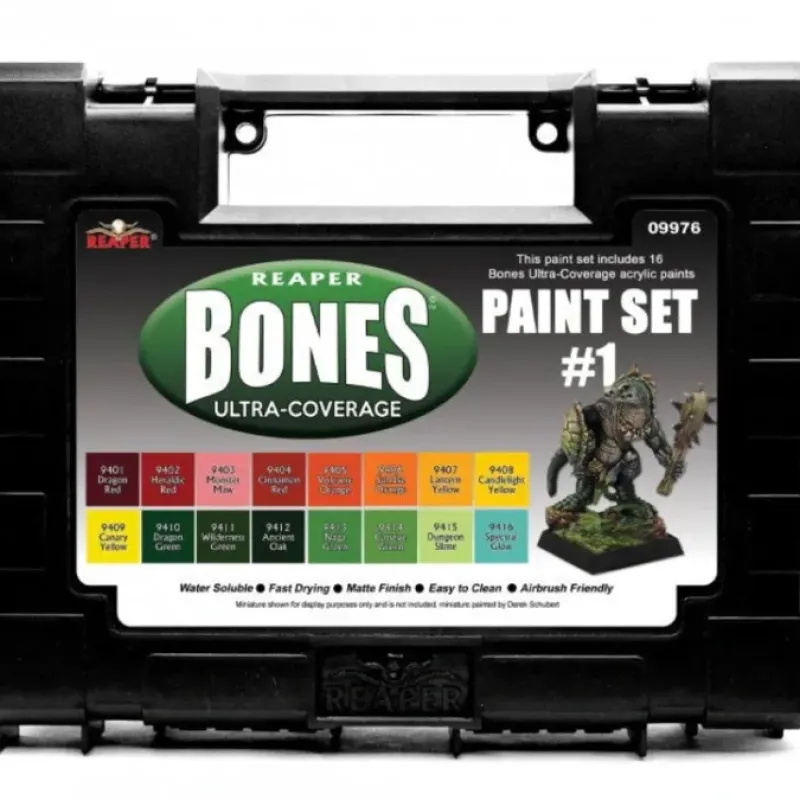 This paint set includes 16 half-ounce (.5 oz) bottles of Bones Ultra-Coverage acrylic paints, specifically designed for miniatures painting. These paints are water-soluble, fast drying, easy to clean, airbrush friendly, and have a matte finish. Bones Ultra-Coverage Paints are ideal for metal, resin, or plastic miniatures! Comes in Reaper Miniature’s newly designed (Summer 2019) hard plastic carrying case!