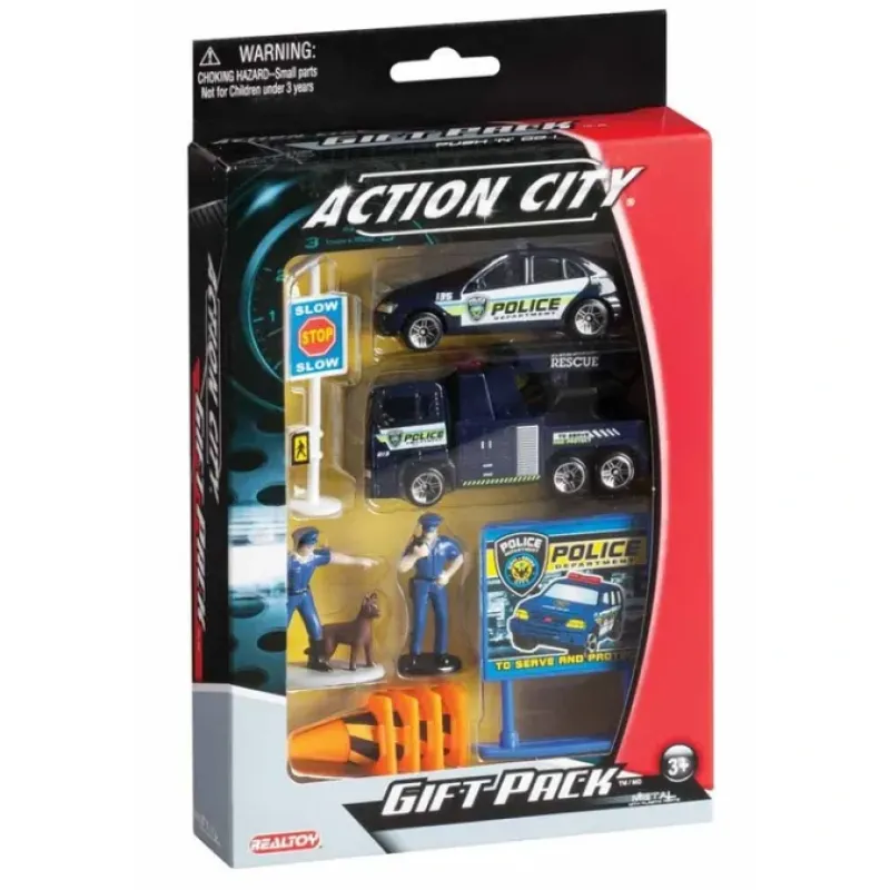 This ten piece police department gift pack includes two police vehicles, two policemen figurines, a road sign, a call box, and four cones. Ages 3+