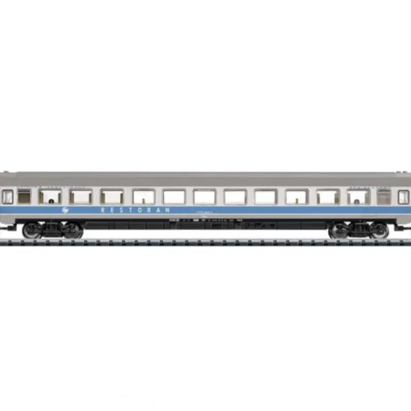 This is a Trix 15096 N Scale Mimara Type Wreelmt Diner – Ready to Run – Minitrix Croatian Railways HZ (Era IV, light blue, gray). Prototype: Croatian Railways (Hrvatske eljeznice, H ) type WReelmt express train dining car for the MIMARA train route Zagreb – Leipzig. Model: The car has close coupler mechanisms. A lighting kit can be installed in the car. Length over the buffers 165 mm / 6-1/2. One-time series. 66656 Lighting kit. 66616 LED lighting kit. This car goes with the 15095 express train passenger car set.