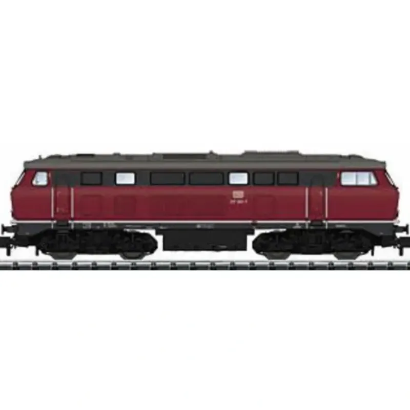 This is a Trix 16272 N Scale Class 217 Diesel – Standard DC – Minitrix German Federal Railroad DB #217 001-7 (Era IV 1983, red, gray). Prototype: German Federal Railroad (DB) pre-production diesel locomotive road number 217 001-7. Diesel hydraulic locomotive with electric train heating. In the crimson paint scheme as the locomotive looked around 1983. Use: Passenger and freight trains. Model: The locomotive has a 14-pin digital connector, and a motor with a flywheel. 4 axles powered. Traction tires. The locomotive has close coupler mechanisms. It also has separately applied grab irons. The locomotive has prototypical changes to the roof details and side vents compared to the regular production version of the class 217. Length over the buffers 102 mm / 4. Highlights: New tooling. Grab irons separately applied.