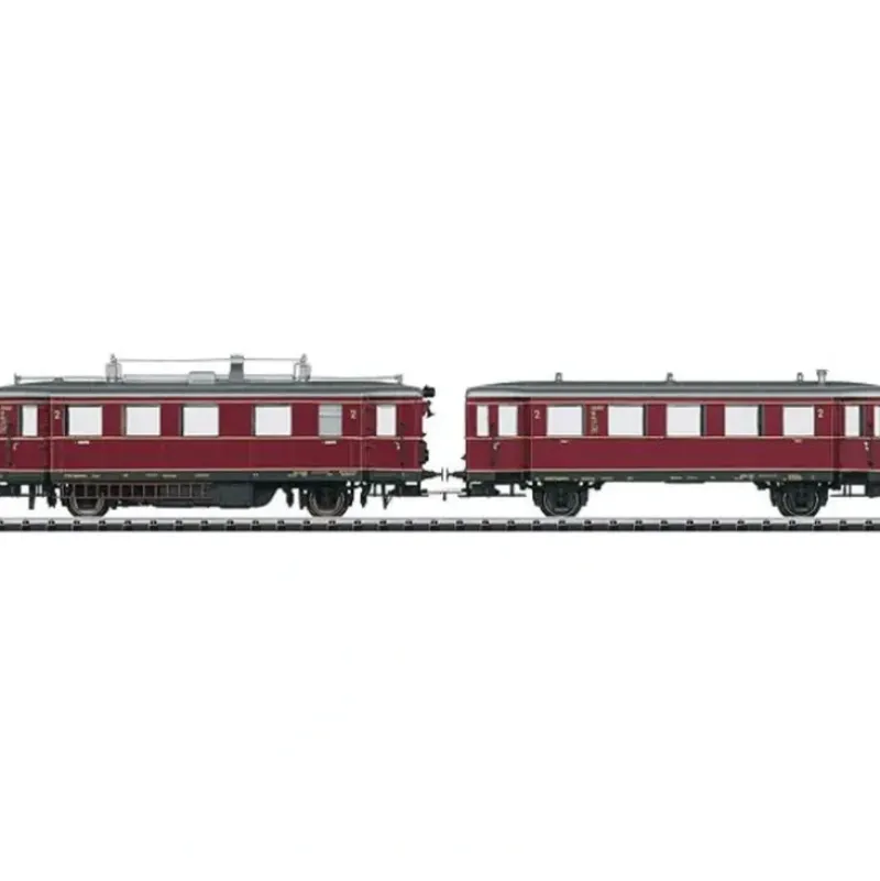 This is a Trix 22675 HO Scale Class VT 75.9 Railcar & VB 140 Trailer Set – Sound & DCC Equipped German Federal Railroad DB (Era III, red, gray) Prototype: German Federal Railroad (DB) 2-unit diesel powered rail car consisting of a class VT 75.9 motor car and a class VB 140 trailer car, 2nd class. Crimson basic paint scheme. The engineer’s areas on the motor car have sunshades and a curved warning horn at both ends. Roof version for the motor car with separately applied roof coolers as well as supply and drain pipes and auxiliary control rods. The motor car and trailer car have older design buffers. Road numbers VT 75 902 and VB 140 042. The cars look as they did around 1959. Model: The powered rail car has a DCC decoder and extensive sound functions. It also has controlled high-efficiency propulsion with a flywheel, mounted in the motor car. Both axles on the motor car are powered. Traction tires. The motor car and trailer car have factory-installed interior lighting. The triple headlights and dual red marker lights on the motor car change over with the direction of travel; they as well as the interior lighting will work in conventional operation and can be controlled digitally. The headlights and interior lighting are maintenance-free warm white LEDs. The red marker lights on the motor car can be turned off on End 2 facing the trailer car. As in the prototype, the trailer car has no headlights. There is a current-conducting drawbar coupling with guide mechanisms between the two cars. The cars have interior details. There is a clear view in the motor car and the trailer car. There are separately applied ladders on the motor car. Length over the buffers for the two-car set 28.1 cm / 11-1/16. Highlights: Completely new tooling. DCC decoder with extensive sound functions. Factory-installed interior lighting with warm white LEDs in the motor car and trailer car. Bodies constructed mostly of metal. Many separately applied details. Road numbers: VT 75 902 and VB 140 042.