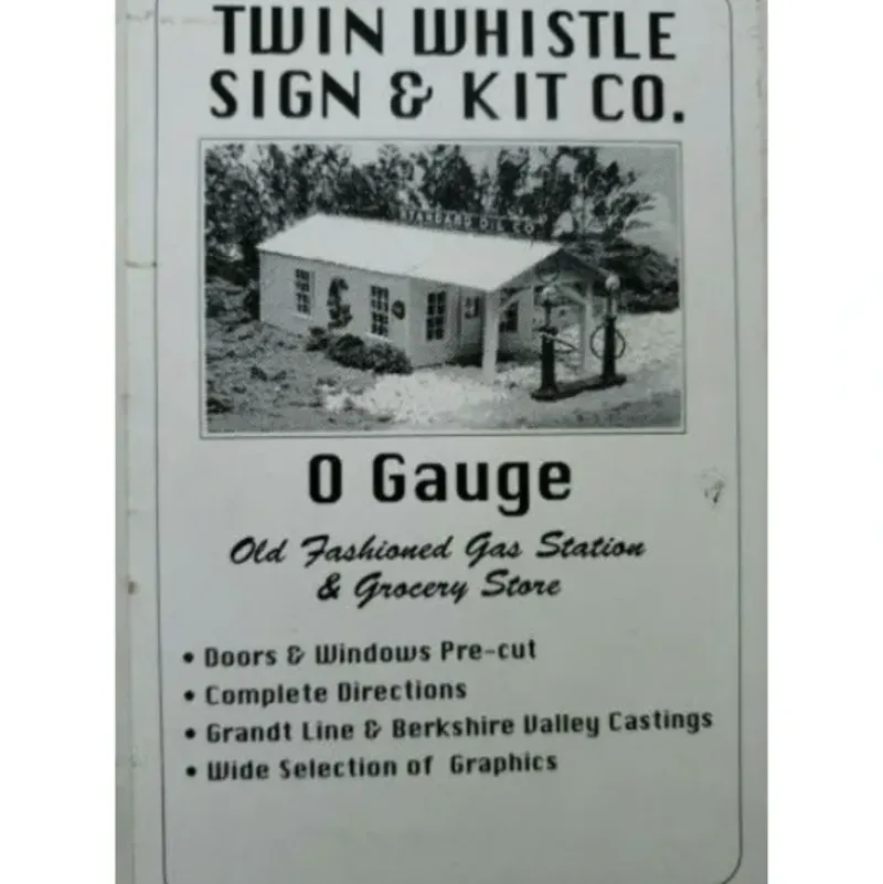 Here is Twin Wistle Sign & Kit Co. O Scale Old Fashioned Gas Station & Grocery Building Kit. This building kit features wooden and plastic parts for construction.
