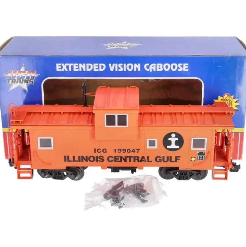 This is a USA Trains 12122 G Illinois Central Gulf Extended Vision Caboose #199047. Feature battery-charging circuit for flashing ETD light on rear (included), interior lighting, quality graphics and metal wheels, handrails and ladders.