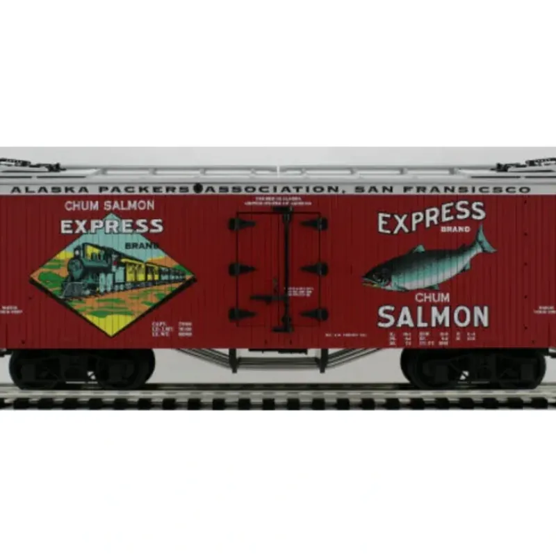 This is a USA Trains 16323 G Express Salmon American Series(R) Refrigerator Cars.