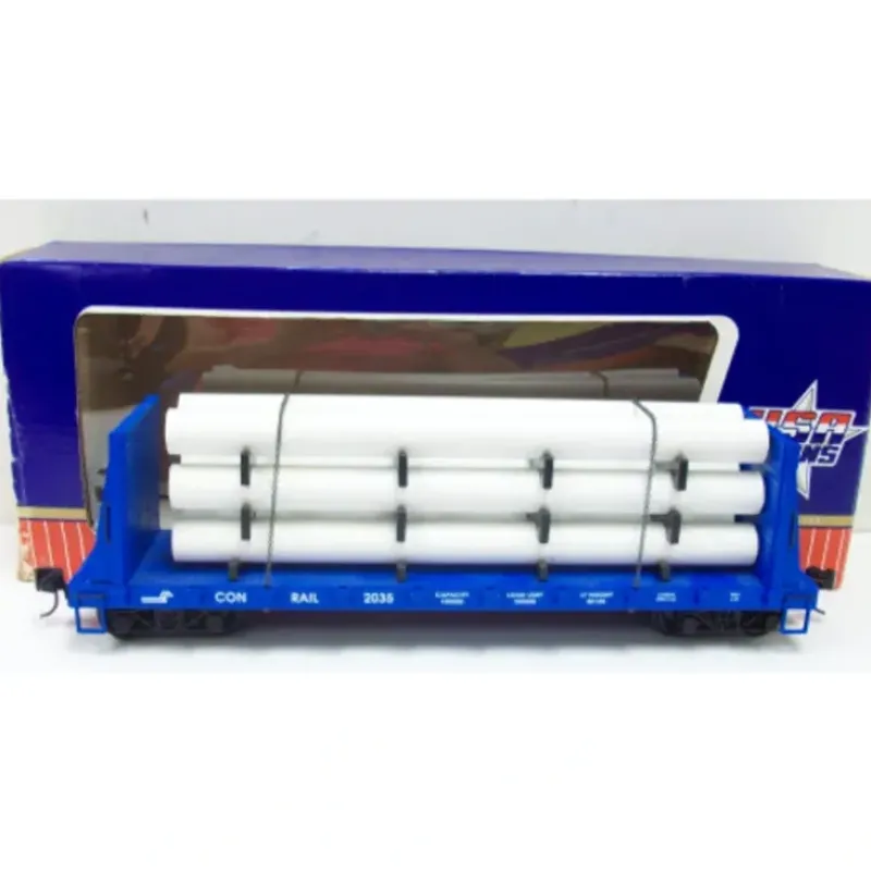 This is a USA Trains 17605 G Conrail Flatcar with Pipe Load. This features Authentic Paint Schemes, Excellent Rivet Detail and Die Works, Pipe Load Secured by Metal Chain, Includes knuckle couplers, and Detailed Bettendorf Trucks.