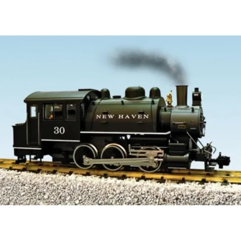 This is a USA Trains 20070 G New Haven Dockside 0-6-0T Steam Locomotive with Sound #30. This features Accurately detailed die-cast metal construction, Operating headlight & cab light and directional backup light, Illuminated marker lights, Operating Smoke Stack, Fully Synchronized Sound System Included, Die-Cast Drivers & Stainless Steel Rims, Highly detailed metal Piping, Metal Drive Rods, Metal Hand Rails, Brass Bell & Whistle, Detailed Builders Plate, and Simulated Coal Load.