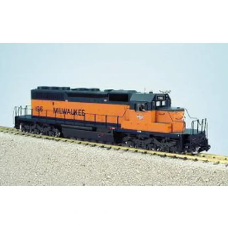 This is a USA Trains 22312 G Milwaukee Road SD40-2 Powered Diesel Locomotive #196. This features Dual 6-wheel motor trucks, Real smoking stack, Directional marker lights, Operating Directional Headlight, Lighted number boards, Operating Doors, Detailed Cab Interior, Interior Lights, highly detailed Platform and Steps, Metal Handrails, PowerTrac Drive System, 12 Point Electrical Pick-Up, Multiple road numbers for running double or triple headed, Quality Graphics, and Length: 26 3/4 Height: 6.