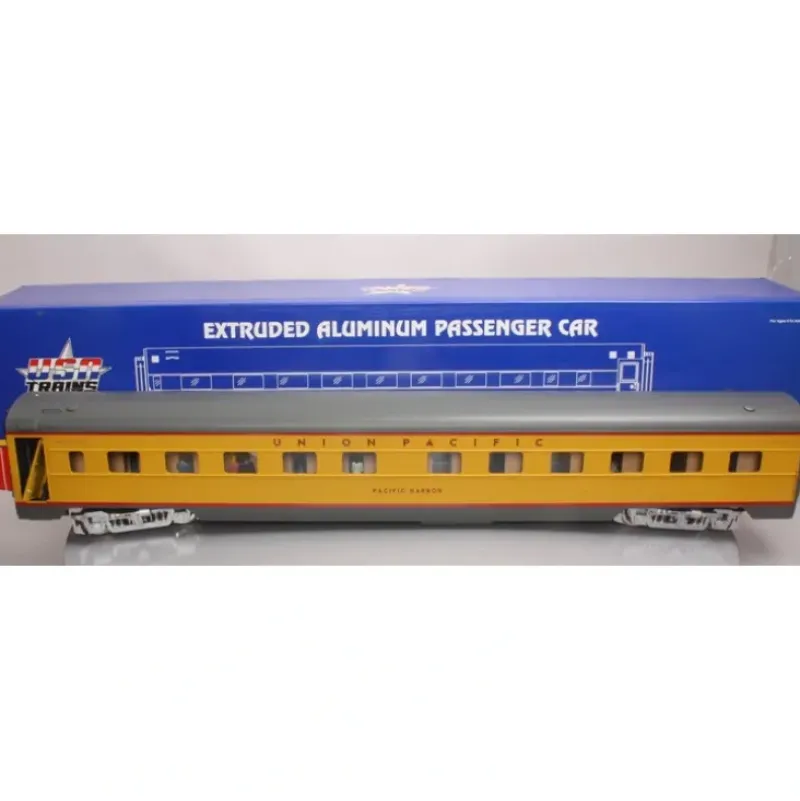 This is a USA Trains 31054 G Union Pacific Pacific Harbor Corrugated Aluminum Sleeper. Each car features an extrude aluminum car body with opening doors with separate door handles, roof ventilators, interior lighting, rubber diaphragms between units, full underframe detail, full interiors with painted figures, metal wheels and separately applied coupler lift bar, air hoses and grab irons. Vista Dome features upper seating area with painted figures; Observation Car has a lighted drumhead and marker lights. Approximate length: 33.