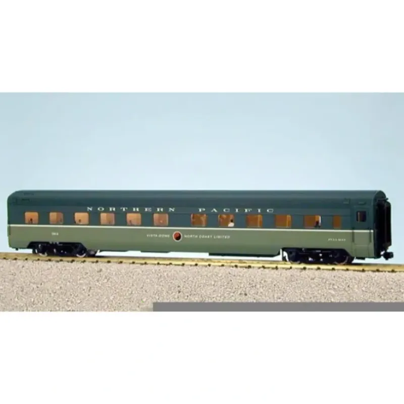 This is a USA Trains 31084 G Northern Pacific “North Coast Limited” Sleeper Car. This car features an extrude aluminum car body with opening doors with separate door handles, roof ventilators, interior lighting, rubber diaphragms between units, full underframe detail, full interiors with painted figures, metal wheels and separately applied coupler lift bar, air hoses and grab irons. Approximate length: 33.