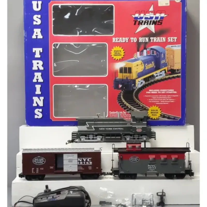 This is a USA Trains 72304 G New York Central Diesel Freight. Each set includes a NW-2 diesel with real puffins smoke, a box car or reefer, a caboose with metal wheels and lights, a 5 x 4′ (approximate) oval layout and a 40 VA power supply.