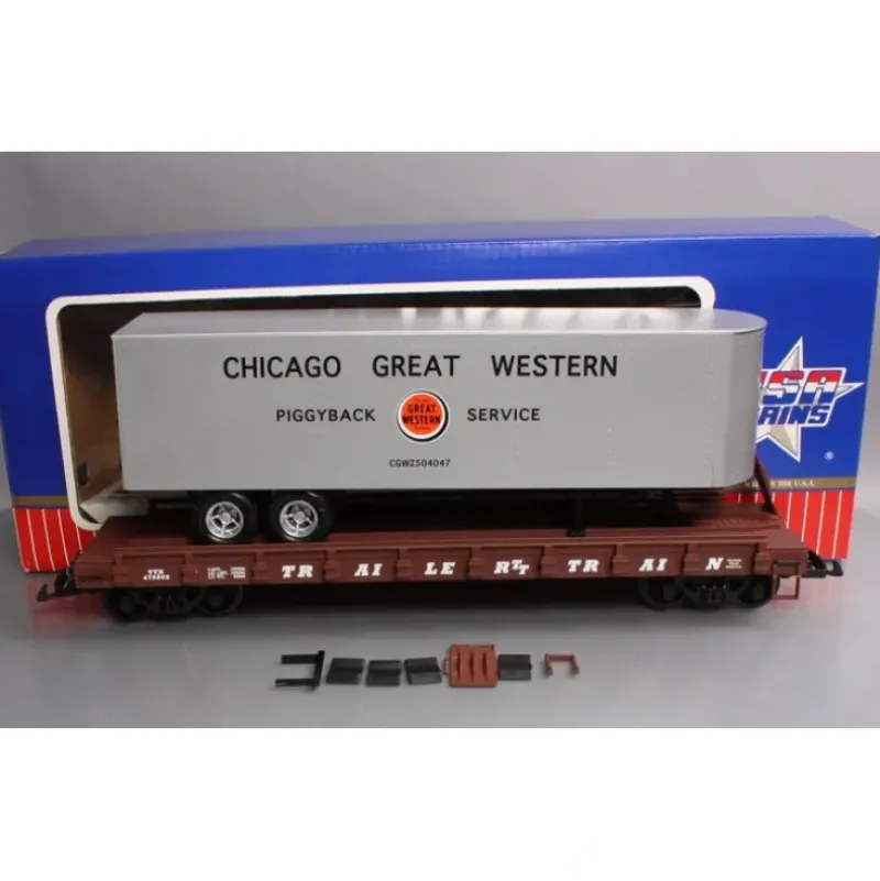 This is a USA Trains R17023 G Chicago Great Western Piggyback Flatcar with Trailer.This car features plastic trucks, operating knuckle couplers, metal wheels and axles. Please see my pictures for additional features.
