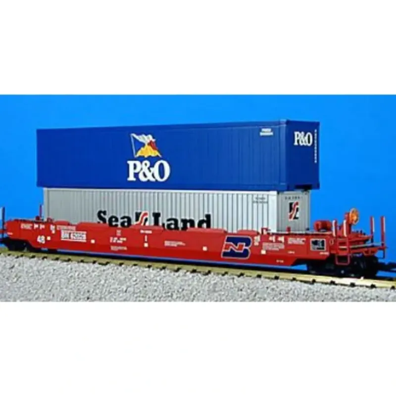 This is a USA Trains 17106 G Burlington Northern Gunderson Husky Stack with 2 Containers #1. This features Real Brass Coupler Lift Bar, Real Brass Walkway, Real Brass Chain on brake, Real Brass brake rod assembly, runs the length of the car, Detailed Brake system, Opening doors, Separately molded grab irons and corner steps, Both hook/loop and knuckle couplers provided in the box, Authentically detailed 125 tom sprung ruller bearing style trucks, Blackened metal wheels, and length is approximately 28.5.