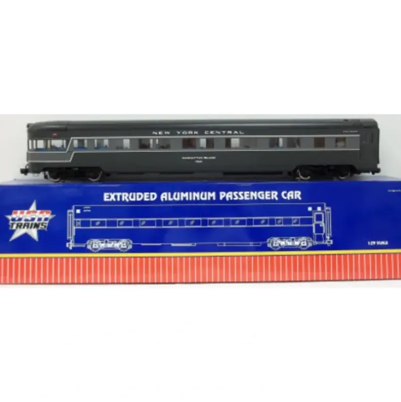 This is a USA Trains 31030 G New York Central 20th Century Limited Corrugated Aluminum Observation Car. Each car features an extrude aluminum car body with opening doors with separate door handles, roof ventilators, interior lighting, rubber diaphragms between units, full underframe detail, full interiors with painted figures, metal wheels and separately applied coupler lift bar, air hoses and grab irons. Vista Dome features upper seating area with painted figures; Observation Car has a lighted drumhead and marker lights. Approximate length: 33.
