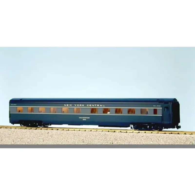 This is a USA Trains 31035 G New York Central 20th Century Limited Corrugated Aluminum Sleeper Lighted #2. Each car features an extrude aluminum car body with opening doors with separate door handles, roof ventilators, interior lighting, rubber diaphragms between units, full underframe detail, full interiors with painted figures, metal wheels and separately applied coupler lift bar, air hoses and grab irons. Vista Dome features upper seating area with painted figures; Observation Car has a lighted drumhead and marker lights. Approximate length: 33.