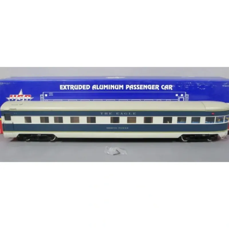 This is a USA Trains 31170 G Missouri Pacific The Eagle Shrine Tower Corrugated Aluminum Observation. Each car features an extrude aluminum car body with opening doors with separate door handles, roof ventilators, interior lighting, rubber diaphragms between units, full underframe detail, full interiors with painted figures, metal wheels and separately applied coupler lift bar, air hoses and grab irons. Vista Dome features upper seating area with painted figures; Observation Car has a lighted drumhead and marker lights. Approximate length: 33.