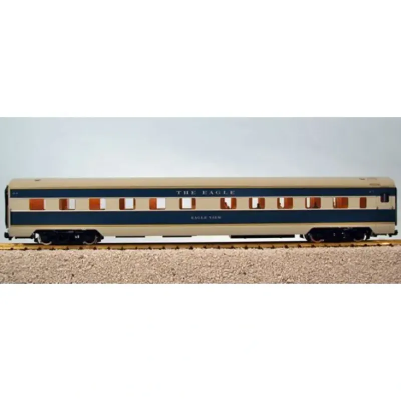 This is a USA Trains 31174 G Missouri Pacific The Eagle View Corrugated Aluminum Sleeper #621. Each car features an extrude aluminum car body with opening doors with separate door handles, roof ventilators, interior lighting, rubber diaphragms between units, full underframe detail, full interiors with painted figures, metal wheels and separately applied coupler lift bar, air hoses and grab irons. Vista Dome features upper seating area with painted figures; Observation Car has a lighted drumhead and marker lights. Approximate length: 33.