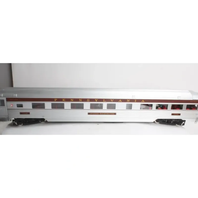 This is a USA Trains 312200 G Pennsylvania Congressional Extruded Aluminium Observation Cars #7126. This features Extruded aluminum car body, Opening doors with separate door handles, Authentic roof ventilators, Separately applied coupler lift bar, air hoses and grab irons, Interior Lighting, Rubber diaphragms between units, Full underframe detail, Full interiors with painted figures, Metal wheels, and Approximate length 33.