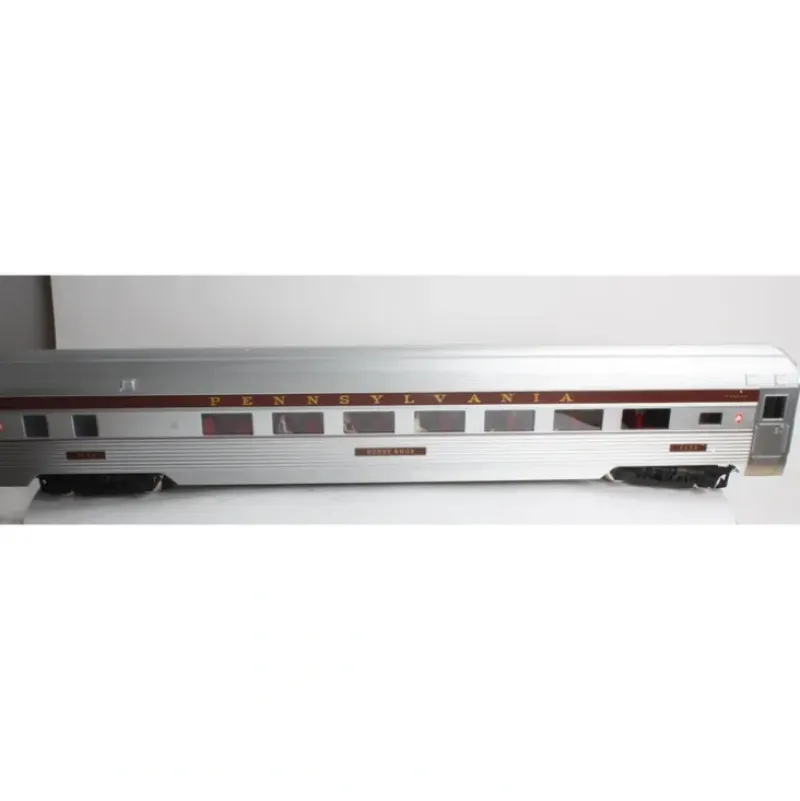 This is a USA Trains 312201 G Pennsylvania Congressional Extruded Aluminium Parlor Cars #1, #7132. This features Extruded aluminum car body, Opening doors with separate door handles, Authentic roof ventilators, Separately applied coupler lift bar, air hoses and grab irons, Interior Lighting, Rubber diaphragms between units, Full underframe detail, Full interiors with painted figures, Metal wheels, and Approximate length 33.