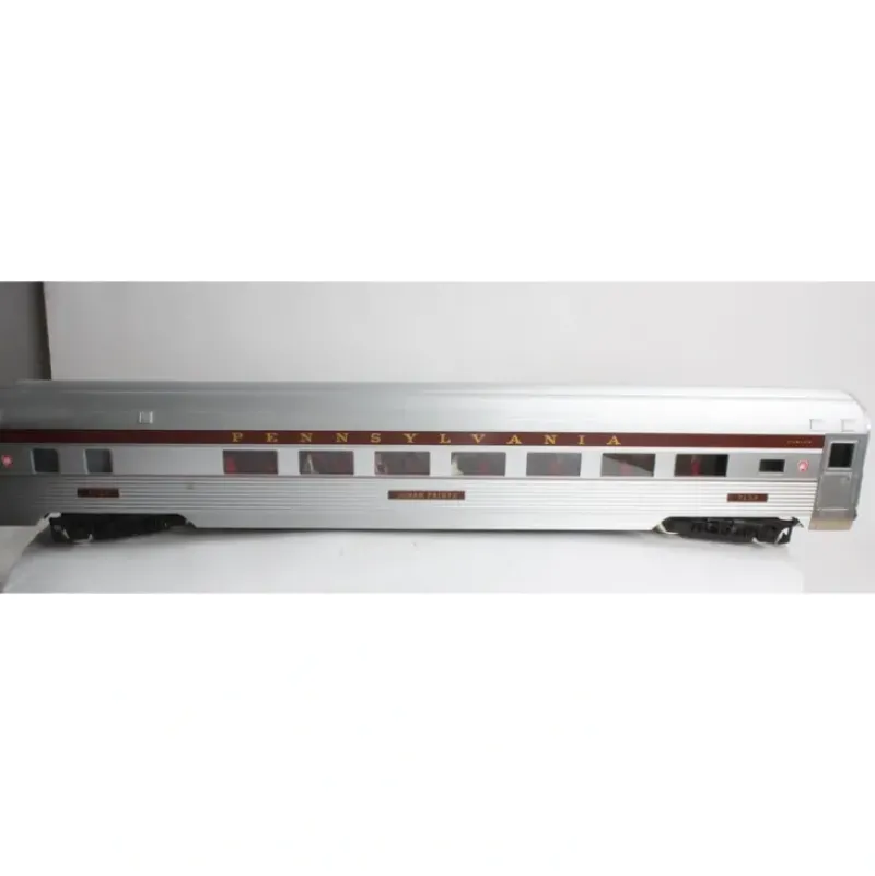 This is a USA Trains 312203 G Pennsylvania Congressional Extruded Aluminium Parlor Cars #7133. This features Extruded aluminum car body, Opening doors with separate door handles, Authentic roof ventilators, Separately applied coupler lift bar, air hoses and grab irons, Interior Lighting, Rubber diaphragms between units, Full underframe detail, Full interiors with painted figures, Metal wheels, and Approximate length 33.