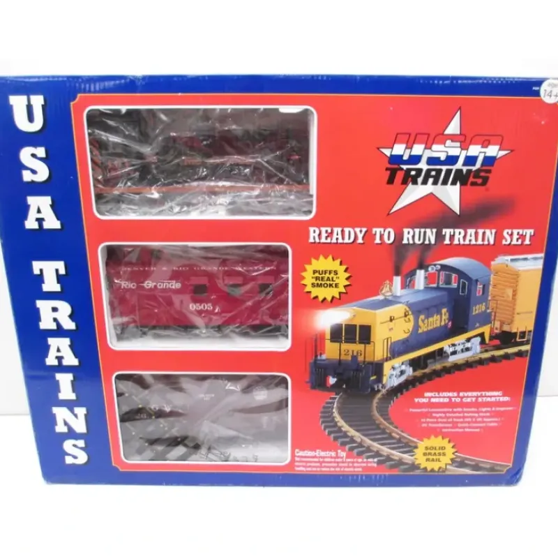 This is a USA Trains 72300 G Denver & Rio Grande Western NW-2 Train Set. Each set includes a NW-2 diesel with real puffins smoke, a box car or reefer, a caboose with metal wheels and lights, a 5 x 4′ (approximate) oval layout and a 40 VA power supply.