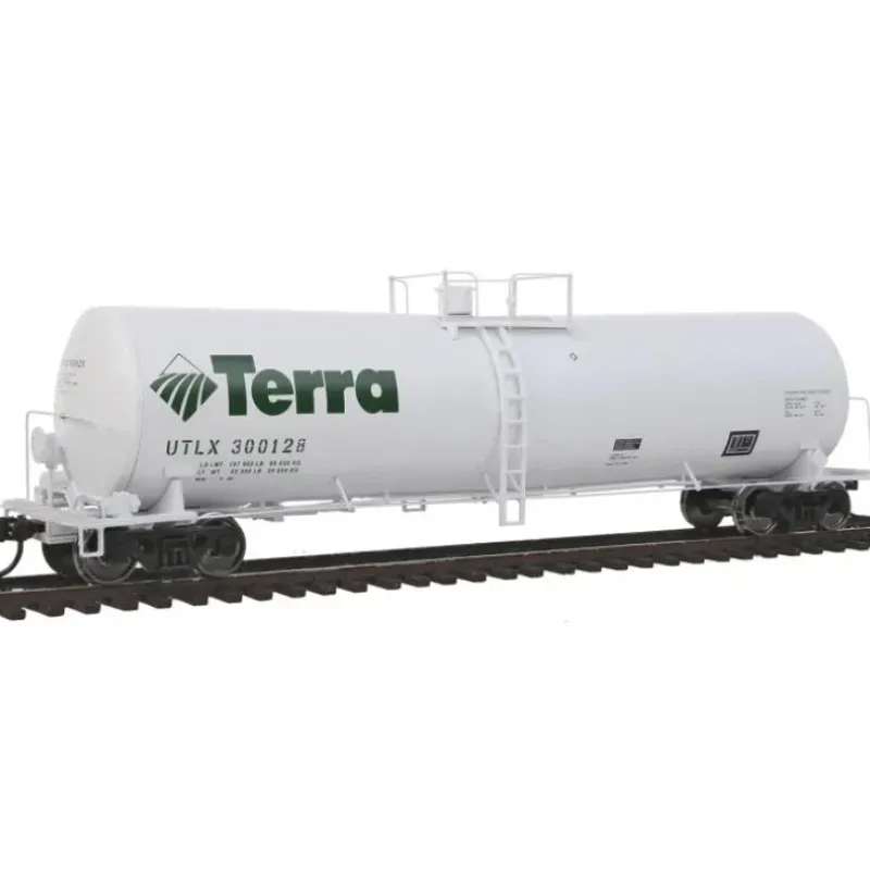 This is a Walthers 920-100230 HO Terra UTLX 54′ Funnel-Flow Tank Car #300128. Developed by the Union Tank Car Company during the 1960s, Funnel-Flow cars carry all kinds of liquids and slurries (mixtures of water and other materials) that can be unloaded by gravity. The car name says it all — the entire tank is slightly lower in the middle, so the contents flow towards the lowest point, like a funnel, for faster, more complete unloading. Funnel-Flow tank cars come in several lengths; dense, heavy liquids are shipped in shorter cars; lighter fluids move in the 54-footers. Many cars that haul thick liquids such as asphalt, molten sulfur and corn syrup, have internal heating coils to reheat the contents for faster unloading. These larger capacity cars are used extensively by the oil industry for hauling heating oil, asphalt, lubricating oil and kerosene. They’re also used in agriculture for hauling corn, oils, alcohol and feed additives, as well as in other industries for various liquids. These great-looking cars are so versatile they’ll be at home on any modern-era railroad. These models feature: * Etched Metal Walkways & Platforms * Factory-Applied Grab Irons * Brake Train Pipe & Brake Rigging Underbody Detail * Road-Specific Placement of Manways & Safety Valves * Correct 36 Turned-Metal Wheelsets * Proto MAX(TM) Metal Knuckle Couplers.
