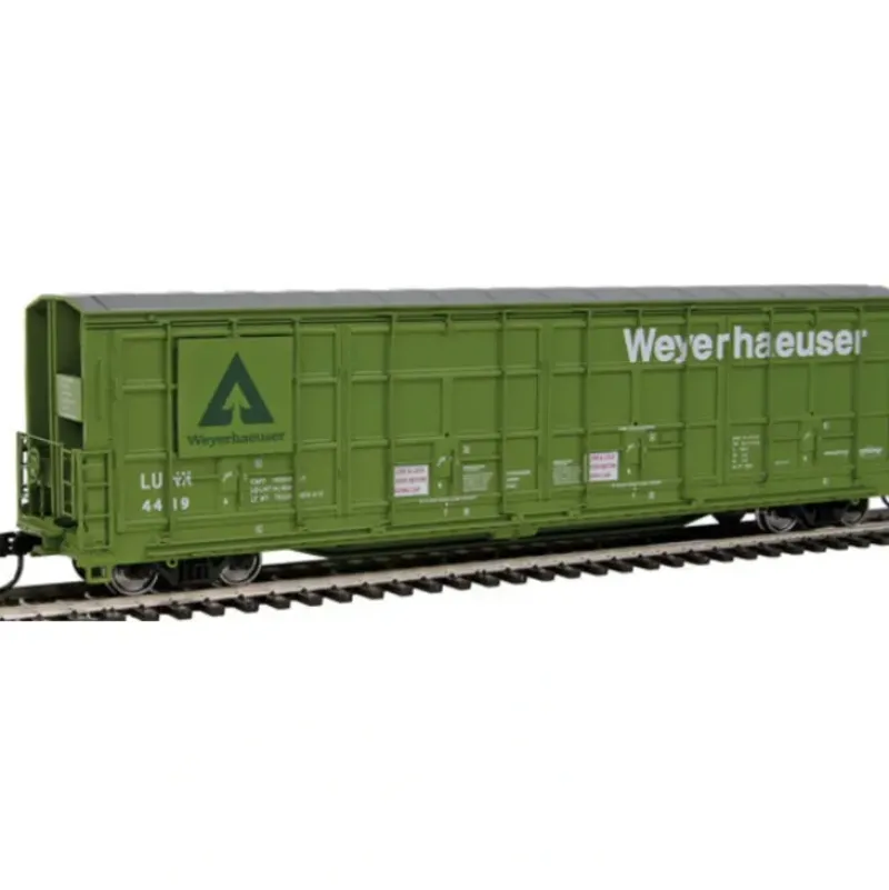 This is a Walthers 920-101914 HO Weyerhaeuser LUNX 56′ Thrall All-Door Boxcar – Ready to Run #4419. Features: Limited Edition – One Time Run of These Roadnumbers!, Hauled Lumber Across the US from late-1960s to Early 2000s, Newly-Tooled Etched Platforms, Brake Wheel & Cross-Over Grabs, Re-Tooled, Finely Detailed & Separately-Applied Ladders, Separately-Applied Latch Bars & Door Handles, Factory-Installed Grab Irons, Ultra-Smooth Rolling Metal Axles & 33 Wheelsets, Proto MAX(TM) Metal Knuckle Couplers.