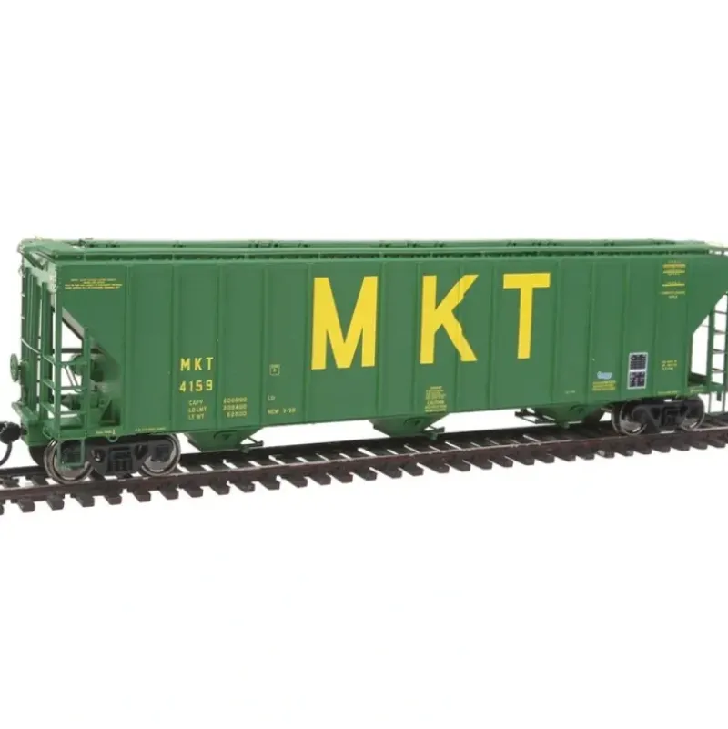 This is Walthers 106103 4780 Cov Hop MKT 4159. WalthersProto 56′ Evans 4780 cubic foot 3-bay covered hopper, ready to run. Missouri-Kansas-Texas #4159 (green, yellow, billboard MKT).