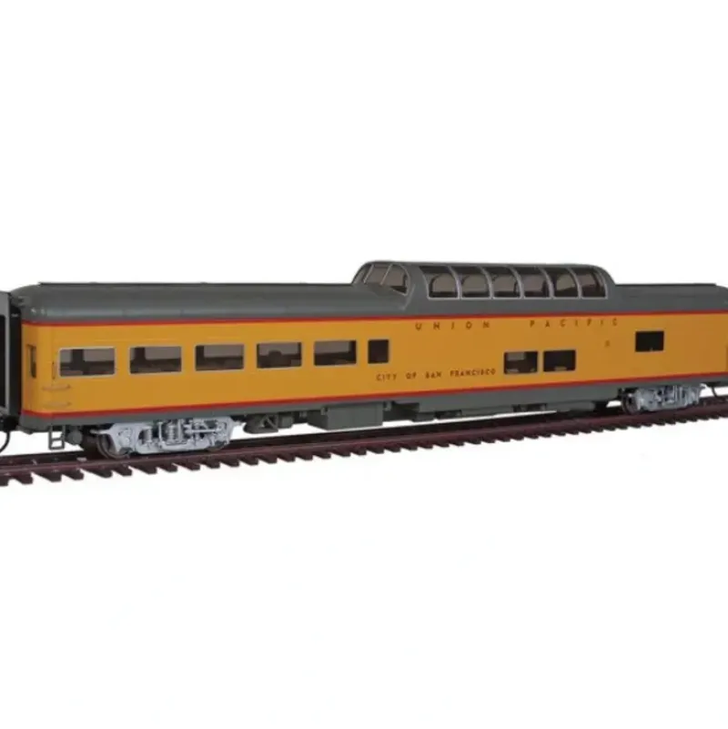 This is a WalthersProto 920-18700 HO Scales 85′ ACF Dome Lounge – Lighted – Ready to Run – UP Heritage Series Union Pacific(R) City of San Francisco. A key part of Union Pacific’s public relations programs, 48 historic passenger cars and three E9 diesels make up part of the famed Heritage Fleet. Many were originally purchased for the City Streamliners, and have been carefully restored and updated to full operating condition. Today, they’re finished in a modern Armour Yellow scheme, and the cars carry names of important cities, famous trains and key people in the railroad’s long history. In service, these rolling goodwill ambassadors travel system-wide and beyond, behind UP’s restored steam and diesel locos, to attend a wide range of public and special events every year. * Perfect For Fan Trip & Excursion Service * Modern-Era UP Excursion Scheme * Factory-Installed LED Lighting * Factory-Printed Car Names * Includes Car Numbers & UPP Reporting Mark Decals to Model Later Versions * Factory-Installed Grab Irons * Prototypically Accurate Window Tinting * Proto MAX(TM) Metal Knuckle Couplers. PLEASE NOTE: As these cars are the correct prototype length and feature full underbody detail to match the prototypes, a minimum 24 radius is recommended for operation. As UP transformed its Streamliners into Domeliners in 1955, 15 new Dome-Lounge Observations were delivered to bring up the rear of the flagship streamliners. Within a year however this proved to be a problem. The cars quickly lost their unique ends and were rebuilt as Dome-Lounges. Named for the famed UP-SP-CNW Streamliner, the prototype has its original windows and lighting for use at the end of the train.