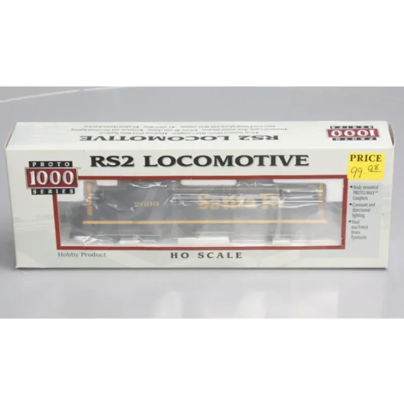 This is a WalthersProto Alco RS2 PROTO 1000. Santa Fe #2099 (blue, yellow). Diesel roadswitchers for transition-era railroads. The RS-2 was Alco’s first roadswitcher to incorporate its new 244-Series prime mover. The 1,500-horsepower units were designed for versatility – they were equally at home working road freights or switch runs. If equipped with a steam generator, they were adept at working commuter and secondary passenger runs. Production began in 1946 with just over 350 units constructed for U.S. and Canadian roads before the unit was succeeded by the 1,600-horsepower RS-3 in 1950 (although a few late RS-2s were rated at 1,600 horsepower).