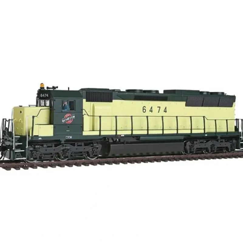 This is a Walthers 920-41052 HO scale EMD SD45 – Tsunami(R) Sound & DCC – PROTO 2000(TM) Chicago & North Western #6474 * Limited Edition – One Time Run of These Engine Numbers * SoundTraxx(R) Tsunami(R) Sound & DCC Full-function decoder with all control, sound and lighting effects. * LED Constant & Directional Headlights * RP-25 Metal Wheels * Proto MAX(TM) Metal Knuckle Couplers Built: 1965-71;some still in service as of early 2011. Several preserved and operating museum units. Primary assignment: Road freight service. Variations: High short hood specified by SOU and N&W. By 1964, six-axle diesels were rapidly evolving from low speed luggers to fast freight engines. EMD continuously updated its Special Duty (SD) series with new models, and celebrated New Years Day 1966 by unveiling six locos powered by variations of its new 645 prime mover. At the top was the SD45, with an enormous 20-cylinder prime mover cranking out 3600 horsepower. Timing couldn’t have been better as American railroads experienced a surge in traffic and were ready to modernize their fleets. The SD45 proved popular for all types of assignments, and 1,260 were built through late 1971, when it was replaced by the SD45-2. Retirements began in earnest in the 1980s, but many were rebuilt and eventually sold to regional railroads. As of 2011, a few are still in use, and several are preserved in museums. Sound & DCC ATSF #5374 ATSF #5380 CNW #6474 CNW #6485 PRR #6110 PRR #6127 UP #12 UP #31 Undecorated Standard DC ATSF #5377 ATSF #5400 CNW #6472 CNW #6482 PRR #6118 PRR #6136 UP #15 UP #18 Undecorated Detailed to match units in service from the late 1980s to mid-90s. * Cab Mounted Headlights * Long Blower Sill Duct * Modern Style Coupler Cut Lever * Large Round-Top Beacon (Nonoperating) * Leslie S-3L Horn * Dynamic Brake Vent * Firecracker Antenna * Air Filter Box * Winterization Hatch * Late Flexicoil Trucks w/2 High Outside Mounted Brake Cylinders * Brake Frame w/3 Brake Shoes