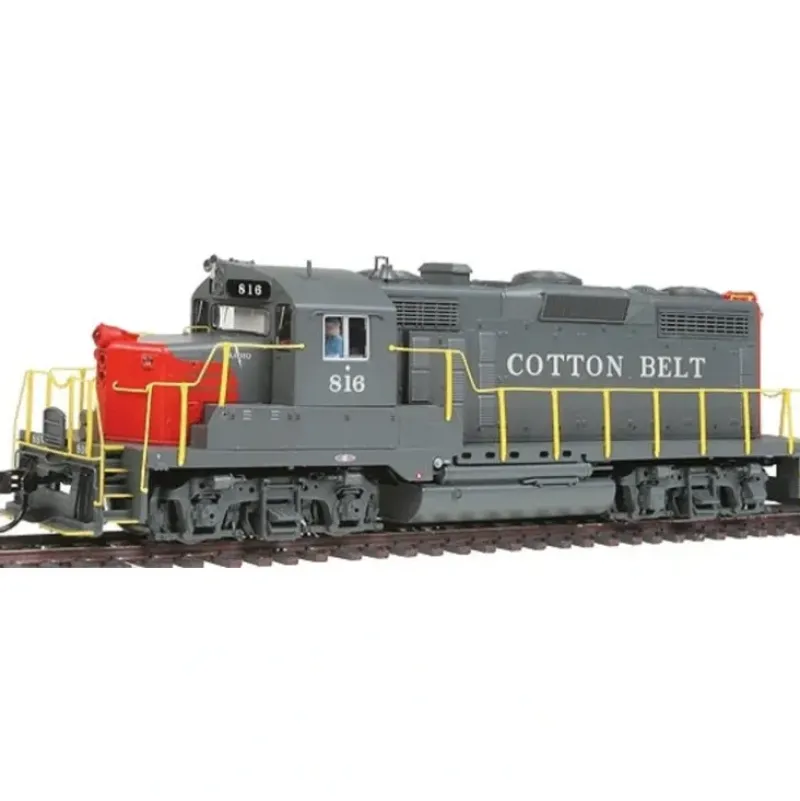 This is a Walthers 920-41566 HO scale EMD GP20 Low Hood – Sound & DCC – PROTO 2000(R) Cotton Belt #816 (gray, red) * Road-Specific Detailing * Five-Pole Skew-Wound Armature Motor * 14:1 Gear Ratio for Easy Multiple Unit Operation * Machined Brass Flywheels * All-Wheel Drive * Precisely Meshed Helical Gears for Silent Running * Constant & Directional Headlights * Heavy Die Cast Chassis for Maximum Traction * Proto MAX(TM) Metal Knuckle Couplers * Soundtraxx(R) Tsunami(R) Sound for DCC & DC Layouts By the mid 50s, increasing pressure from long-haul trucks, declining passenger revenues and mounting costs forced western railroads to find new ways to improve service. Faced with expensive overhauls of early cab and hood unit diesels, many began looking at new equipment as well as ways to improve existing motive power. In 1955 Union Pacific equipped several GP9s with turbochargers as an experiment. Their success inspired EMD to create its own turbocharger for the 567 prime mover, leading to the introduction of the six-axle SD24 in 1958. Further experiments in 1959 created a four-axle version, dubbed the GP20. Early in their careers, the new units were typically assigned priority freights that demanded higher speeds. With the arrival of newer power, they were gradually bumped into secondary runs, and eventually spent their last years in local and yard service. Following their retirement, a few went to work for shortline operators. Western Pacific #2001, the very first GP20, was donated by UP to the Feather River Rail Society in 1985, where it has been restored to its as-built appearance. Sound & DCC CB&Q #911 CB&Q #925 EMD #5625 EMD #5628 NS #2008 NS #2009 SSW13 SSW16 Standard DC CB&Q #905 CB&Q #931 EMD #5626 EMD #5627 NS #2008 NS #2009 SSW12 SSW15 Detailed to match Phase 1b units in service from about 1962-65 with: * Dynamic Brakes * Pan-Top 48 Front & Rear Radiator Fans * Nose-Mounted Headlights w/Pyle-National Red Warning Light * Cab-Mounted Pyle-National White Warning Lights * Low Rear-Mounted Headlights w/Pyle-National White Warning Lights & Red Warning Light * Cab-Mounted Bell * Firecracker Antenna * Raised Leslie S-3L Horn * Round & Square Truck Journal Bearings (From F Unit Trade-Ins)