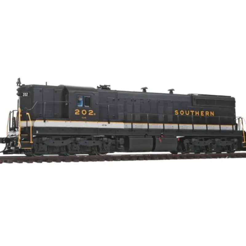 This is a Walthers 920-41613 HO scale EMD SD9 – Tsunami(R) Sound & DCC PROTO 2000(R) Southern #202 (black, Imitation Aluminum) * Limited Edition — One Time Run of These Roadnumbers! * New Schemes * Road-Specific Detailing * 14:1 Helical Gears for Smooth, Quiet Performance * Five-Pole Skew-Wound High-Torque High-Efficiency Can Motor * Low Speed Under 3 Scale MPH * LED Constant & Directional Headlights * Easy Multiple Unit Operation * Metal Grab Irons & Lift Rings * Factory-Installed Tsunami Sound & DCC * Proto MAX(TM) Metal Knuckle Couplers The debut of the SD9 in 1954 marked the next step forward for EMD’s Special Duty line of six-axle diesels. Except for the placement of the class lights, the SD9 looked almost the same as the SD7 introduced in 1952. But under the hood, the new 567C prime mover delivered 1,750 horsepower. While four-axle power still dominated overall sales, the SDs were soon drawing well-deserved attention. In service, the three-axle Flexicoil trucks delivered almost twice the pulling power of their GP counterparts, proving ideal for demanding assignments in helper, yard, transfer and heavy freight service. With its weight spread over six axles, the SD9 was also well suited to lightly built routes, and many were purchased especially for branch line duties. By the time production ended in 1959, 515 SD9s were in service on over a dozen railroads. Some are still going strong after 50+ years of service! BNSF #6142 Tsunami Sound & DCC BNSF #6145 Tsunami Sound & DCC BNSF #6127 Standard DC BNSF #6134 Standard DC Conrail #6908 Tsunami Sound & DCC Conrail #6922 Tsunami Sound & DCC Conrail #6911 Standard DC Conrail #6917 Standard DC Southern #202 Tsunami Sound & DCC Southern #207 Tsunami Sound & DCC Southern #205 Standard DC Southern #206 Standard DC Southern Pacific #5342 Tsunami Sound & DCC Southern Pacific #5354 Tsunami Sound & DCC Southern Pacific #5353 Standard DC Southern Pacific #5368 Standard DC Detailed to match Phase 2 units from the mid-1970s to 1980 with * Short Hood Forward Operation * Rolled Metal Style Handrail Stanchions * Two-Color End Handrails * Modern Style Coupler Cut Lever * Ladder on Right Side of Short Hood End * Nose Mounted Bell * Leslie Single Mount A-200 & S-5T Horns * Arched Spark Arrestors * Firecracker Antenna * No Footboards on Pilots Prototype photo courtesy George W. Hamlin