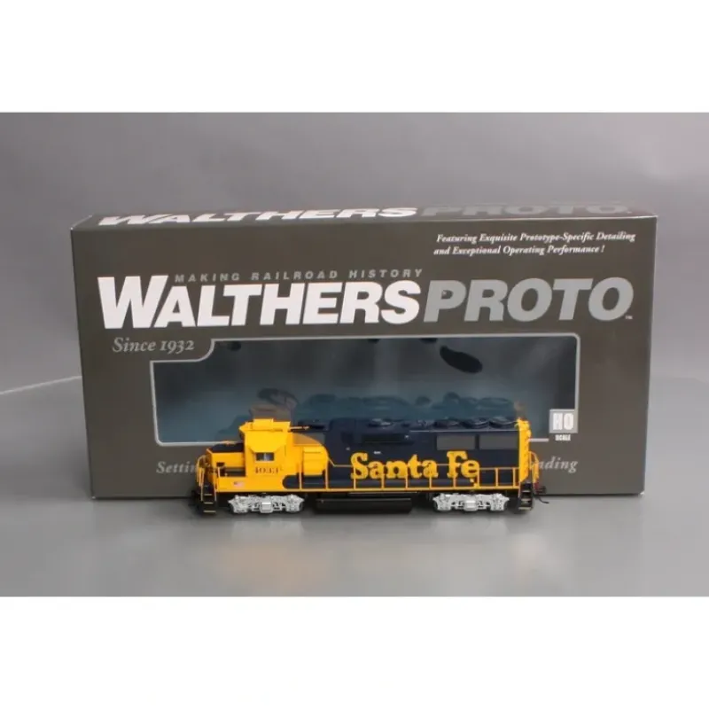 This is a WalthersProto 920-41809 HO Scale EMD GP60 – Soundtraxx(R) Tsunami(R) Sound & DCC Santa Fe #4033 (blue, yellow w/American flag). Built 1985-1994, most still in service Primary Assignment: Fast intermodal and light, priority freight; later used in general freight service as well as local and yard work. As computer technology advanced in the 1980s, EMD took a major step forward with the introduction of the new GP60. Directly behind the cab, a trio of microprocessors regulated and ran various onboard systems, replacing complex wiring circuits and relays. Coaxing 3,800 horsepower from its 16-cylinder 710G3A prime mover, the four-axle GP60 was well suited for fast freight service and was often seen on the point of priority trains when new. While the GP60 proved the advantages of computer control, potential buyers were more interested in six-axle power, and EMD focused its development efforts on the bigger units. For now, the GP60 may be the last in a long line of geeps. * Limited Edition – One Time Run of These Roadnumbers! * Prototypes in Service 1985 to the Present * Perfect Power for All Modern Freight Assignments * NEW – Working Front Ditch Lights as Appropriate * Road-Specific Details * Available with Factory-Installed SoundTraxx Tsunami Sound for DCC and DC Layouts * 14:1 Helical Gears for Smooth, Quiet Performance * Five-Pole Skew-Wound High-Torque High-Efficiency Can Motor * Low Speed Under 3 Scale MPH * LED Constant & Directional Headlights * Easy Multiple Unit Operation * Metal Grab Irons & Lift Rings * Proto MAX Metal Knuckle Couplers Detailed to match units in service from 1991 to BNSF merger with: * Brass Nathan K-3 Air Horn with Elevated Stand * Low Hood with Headlight and Lever Handbrake * Beacon Sub-base * Sinclair Radio Antenna with Ground Plane * Cab Number Boards * Short Sill Duct with Long Handrail