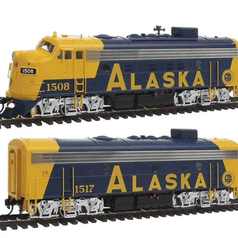 This is a WalthersProto 920-47710 HO Scale EMD F7 A-B Set w/48 Dynamic Fan – Standard DC Alaska Railroad #1500, 1517 (1982+ Scheme, blue, yellow). Limited Edition – One-Time Run of these Unit Numbers . Based on Units in Service 1982-Retirement with: * Snowplow Pilot * 48 Dynamic Brakes * Rotary Beacon * Single Headlight on A Units * Fire Cracker Radio Antenna * Additional Grab Irons & Ladder Stand-Offs on A & B Units * Modified Fuel Tank Skirts * MU Plug on A Unit Nose * Photo-etched Metal Sunshades & Grilles * Separately Applied Wind Deflectors * Elevated Air Horn * Winterization Hatch. Features: – Great Power for Walthers Alaska Railroad Cars – Authentic Bulldog Nose – 14:1 Gears for Smooth, Quiet Operation – 5-Pole Skew-Wound High-Torque, High-Efficiency Can Motor – Low Speed Under 3 Scale MPH – LED Constant Headlight – Proto MAX Metal Knuckle Couplers