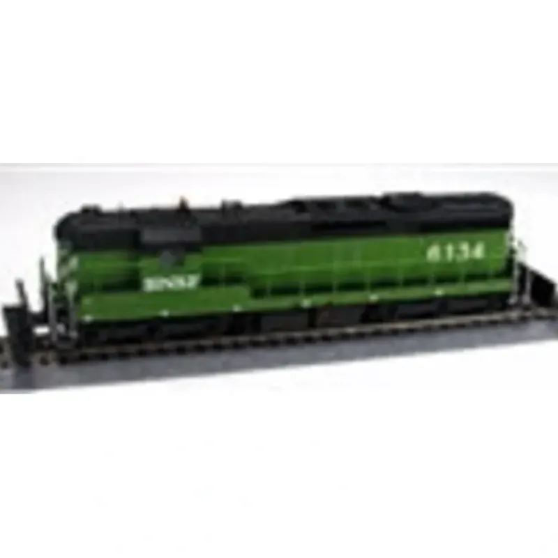 This is a Walthers 920-48610 HO Scale EMD SD9 – Standard DC – PROTO 2000 Burlington Northern Santa Fe #6134 (Patch; Cascade Green, black). The debut of the SD9 in 1954 marked the next step forward for EMD’s Special Duty line of six-axle diesels. Except for the placement of the class lamps, the SD9 looked almost the same as the SD7 introduced in 1952. But under the hood, the new 567C prime mover delivered 1,750 horsepower. While four-axle power still dominated overall sales, the SD’s were soon drawing well-deserved attention. In service, the three-axle Flexicoil trucks delivered almost twice the pulling power of their GP counterparts, proving ideal for demanding assignments in helper, yard, transfer and heavy freight service. With its weight spread over six axles, the SD9 was also well suited to lightly built routes, and many of were purchased especially for branch line duties. By the time production ended in 1959, 515 SD9s were in service on over a dozen railroads. Some are still going strong after 50+ years of service!* In Service 1954 – Present * New Road Specific Details as ppropriate Correct Horn Style & Placement Correct Truck Journals & Other Details Pilots With or Without Footboards Add-On Superdetails * 14:1 Helical Gears for Ultra-Quiet & Smooth Running * Easy Multiple Unit Operation * Superb Paint & Lettering * Metal Grab Irons & Lift Rings * LED Constant & Directional Headlights * Five-Pole, Skew-Wound, High-Torque, High-Efficiency Can Motor * Proto MAX(TM) Metal Knuckle Couplers
