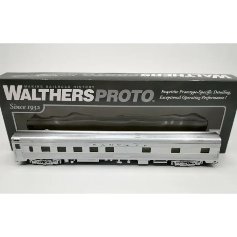 This is a WalthersProto 920-9012 HO Scale 85′ Budd Pine Series 10-6 Sleeper – Lighted – Ready To Run – Super Chief Santa Fe (Real Metal Finish) Santa Fe’s finest comes to your layout in style with the latest HO Scale Super Chief. With a real metal finish simulating the patina of stainless steel, these cars look great in operation as a traditional consist, or combined with matching Walthers El Capitan equipment to model the post-1958 train. Like the prototypes, Walthers Super Chief will be moving fast! Don’t miss out — pre-order these amazing new models today. * Real Metal Finish Simulates Stainless Steel * Prototypical Finish Color Matches El Capitan Cars * Perfect for Modeling Combined Super Chief/El Capitan & other Santa Fe Trains * Available with Factory Installed LED Interior Lighting * Detailed Interiors * Factory Installed Grab Irons * Prototypically Accurate Window Tinting PLEASE NOTE: As these cars are the correct prototype length and feature full underbody detail to match the prototypes, a minimum 24 radius is recommended for operation. Model a Complete Super Chief with these WalthersProto Models: Standard Cars 63′ Budd RPO 73′ Budd Baggage Car 85′ Budd Pine 10-6 Sleeper 85′ P-S 29-Seat Dorm Lounge 85′ P-S 36-Seat Diner 85′ P-S Regal 4-4-2 Sleeper 85′ P-S Pleasure Dome Lounge 85′ P-S Vista Observation With Factory Installed LED Lighting: 85′ Budd Pine 10-6 Sleeper 85′ P-S 29-Seat Dorm Lounge 85′ P-S 36-Seat Diner 85′ P-S Regal 4-4-2 Sleeper 85′ P-S Pleasure Dome Lounge 85′ P-S Vista Observation ATSF 16-Class F3 Long Bonnet Diesels With Tsunami(R) Sound for DCC & DC Layouts A-B Set #16L & 16A A-B Set #16C & 16B A Unit #16L A Unit #17C Standard DC A-B Set #18L & 18A A-B Set #18C & 18B A Unit #20L A Unit #20C