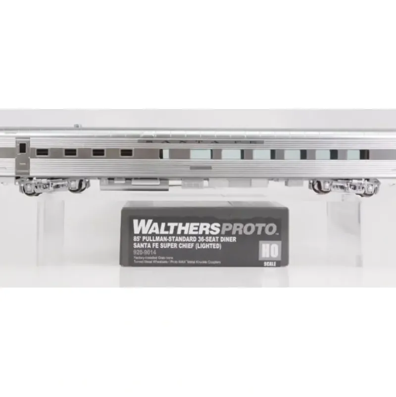 This is Walthers 920-9014 85′ PS 36-St Dnr LTD ATSF. WalthersProto Super Chief 85′ Pullman-Standard 36-seat diner, lighted, ready-to-run. Santa Fe (plated metal finish). Santa Fe’s finest comes to your layout in style with the latest HO Scale Super Chief. With a real metal finish simulating the patina of stainless steel, these cars look great in operation as a traditional consist, or combined with matching Walthers El Capitan equipment to model the post-1958 train. Like the prototypes, Walthers Super Chief will be moving fast! Don’t miss out — pre-order these amazing new models today.